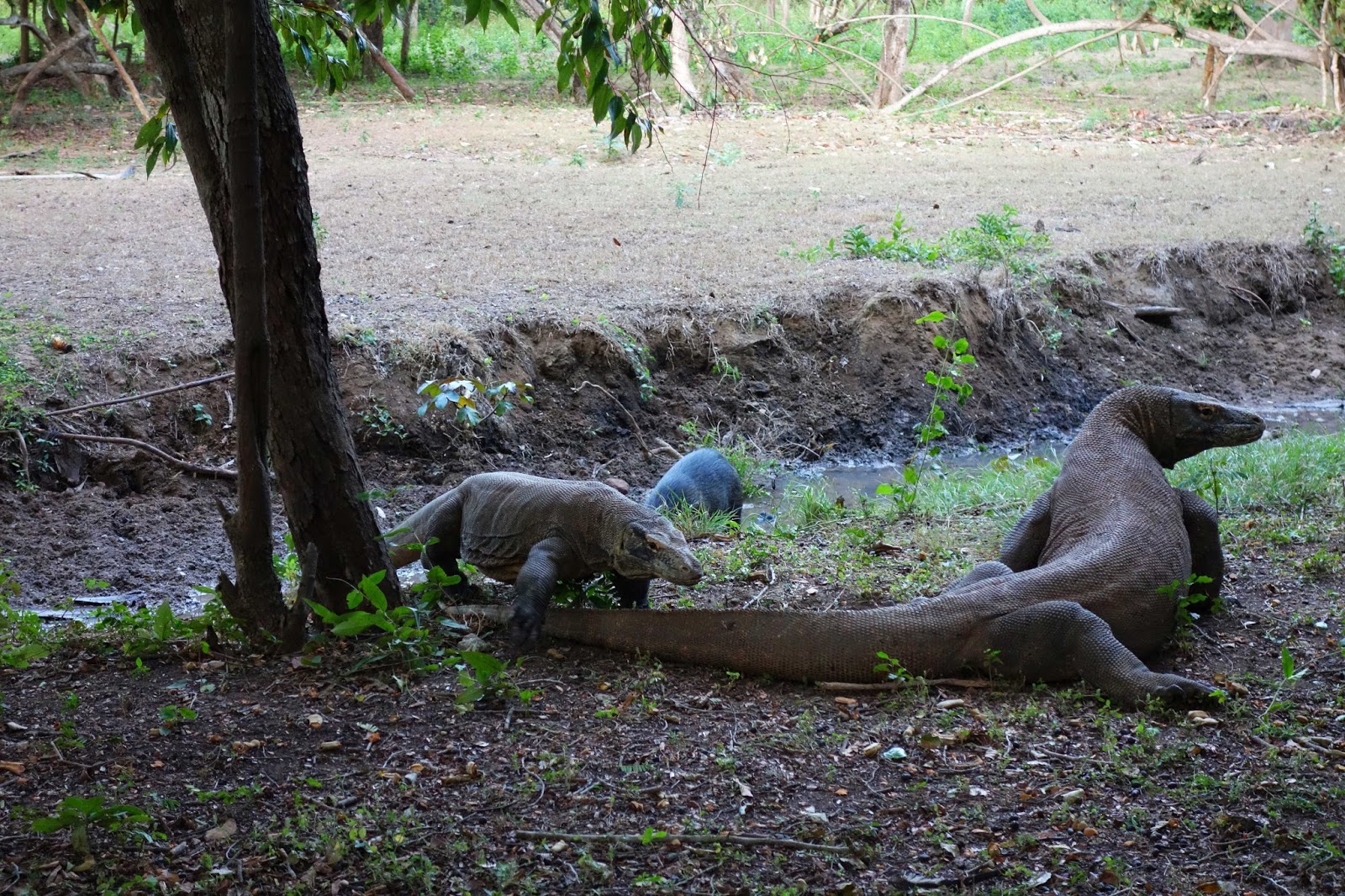 Mir wäre es trotzdem lieber er hätte eine Knarre dabei. Insbesondere als wir an einer Stelle an einem ganzen Haufen von Waranen (etwa sieben ausgewachsene Tiere) vorbeikommen und nur zwei Führer anwesend sind, bin ich ob der Stockverteigigungstechnik eher skeptisch. Die Jungs müssen aber unbedingt Fotos mit (!) den Waranen schießen bis sich einer auf uns zubewegt und ich nervös werde. Da beschließen sogar die Jungs, dass wir lieber weitergehen wollen.