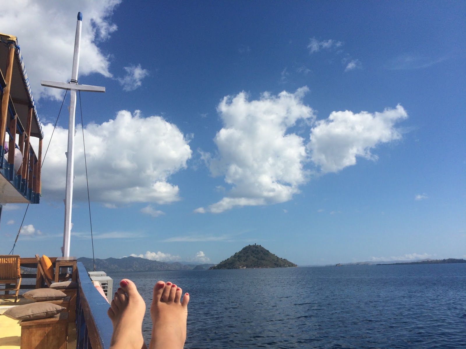 Völlig gerädert steigen wir auf die riesige Personen- und Autofähre von Sape nach Labuan Bajo auf der Insel Flores. Eigentlich wollten wir auf den Komodo Inseln übernachten, doch das ist leider nicht möglich – jetzt werden wir erstmal an ihnen vorbei fahren. Von Sape aus gibt es sowieso keine Touristentouren zu den Komodo Inseln. Wir wollen aber unbedingt dorthin, um dort auf Komodo oder Rinca die Komodo Dragons zu sehen – die Komodowarane, bei den Einheimischen bekannt als die Komodo Drachen (oder einfach nur “dragons” (Drachen)). Auf der 8-stündigen Überfahrt suchen wir uns jeder eine Holzbank mit Blick aufs Meer und dösen schnell ein.