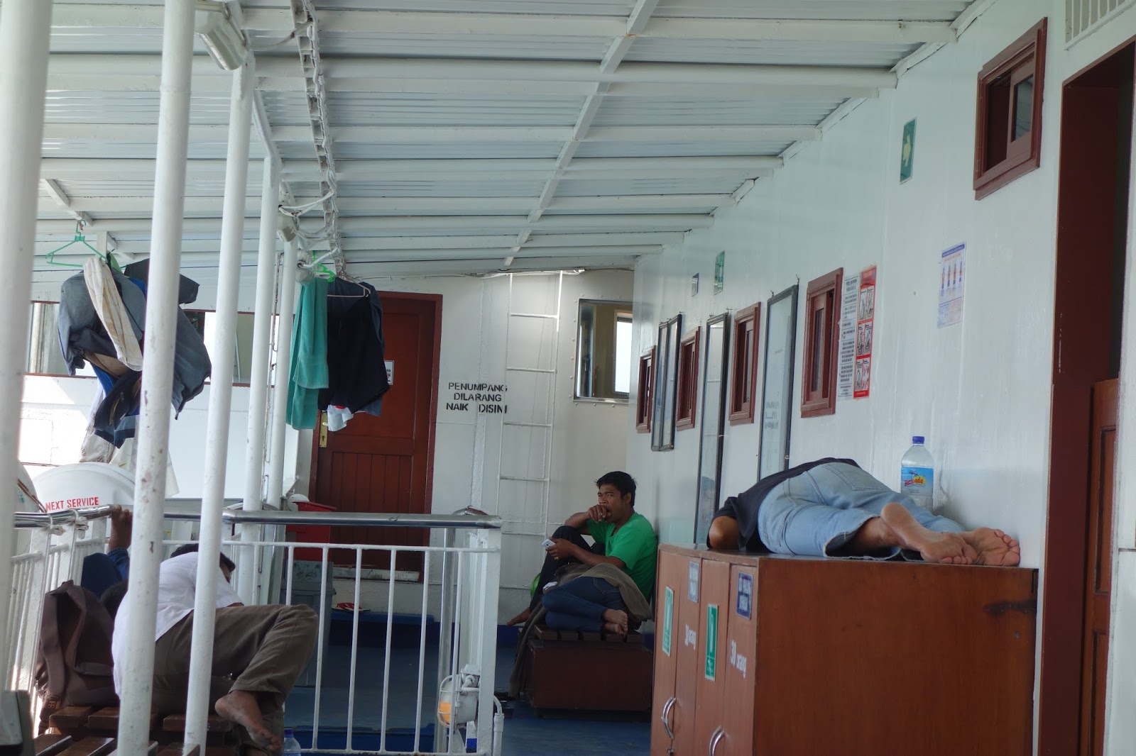 Im Schlaf passieren wir wieder eine Religionsgrenze: Flores hat etwa eine Million Einwohner, von denen 90 % katholisch sind. Die Portugiesen haben hier mal wieder ganze missionarische Arbeit geleistet. 😉 Von den Portugiesen stammt auch der Name “Flores” – “Blumen”, obwohl die Insel nicht blumiger ist als andere und keiner weiß, warum die Portugiesen ausgerechnet diese Insel so genannt haben. Vielleicht sind Ihnen einfach die kreativen Namen ausgegangen? Wie wir so an den Komodos vorbeischippern finde ich es immer noch unglaublich, dass klitzekleine Länder wie Holland und Portugal vor hunderten von Jahren bis in diese hinteren Ecken der Welt vorgedrungen sind und diese dann auch noch kolonialisiert haben!Irgendwann können auch wir nicht mehr auf den harten Holzbänken schlafen und es folgt eine Fotosession mit diversen indonesischen Mitreisenden. Einer davon ist ein junger Student. Er studiert in Magelang auf der Insel Java, und ist seit 24 Stunden ununterbrochen mit Bussen und Fähre unterwegs, um seine Familie in Labuan Bajo zu besuchen. Und er ist bestens gelaunt. Sofort fühle ich mich schlecht, weil ich total fertig bin, obwohl wir noch nichtmal acht Stunden unterwegs sind. Verweichlichte Westler, aber Hallo! Die restliche Fahrt diskutieren wir angeregt mit einem Anwalt und einem Polizisten über Korruption. Angeblich seien nur die dicken Politiker und die großen Polizeichefs korrupt – nicht die kleinen Straßenpolizisten…naja, wer’s glaubt! ;D Jedenfalls passt das nicht mit unseren Beobachtungen zusammen: Zum Beispiel steht vor der Polizeistation in Bima “zufällig” ein Geldautomat.