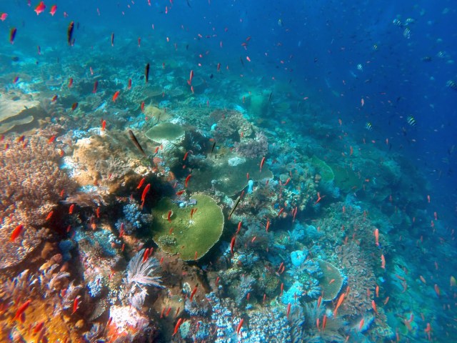 Kaum haben wir was gegessen gehts auch schon zum nächsten “Tauchgang”. Köpfchen ins Wasser, Ärschchen in die Höh’. Wir schnorcheln an Batu Balong, einem der bekanntesten Tauchorte der Welt. Es ist absolut faszinierend: Batu Balong, ist ein großer Fels, der aus dem Wasser ragt und in der Mitte ein Loch hat – wie ein Nadelende mit Nadelöhr. Unter Wasser wird der Fels zwar langsam breiter, aber es gibt eine lange, korallenbewachsene Felswand zu sehen mit allem was die Unterwasserwelt so hergibt. Es ist als ob man in einem Unterwasserzoo wäre – pulsierende Korallen in allen Formen und Farben, tausende verschiedene Fische und Fischschwärme, die sich an unserer Anwesenheit auch überhaupt nicht zu stören scheinen, blaue kopfgroße Seesterne, unicorn fish, lion fish, box fish, needle fish, nudi branch, moränen, clown fish und sogar kleinere Haie (black tip und white tip). Ich habe mich natürlich vorher informiert, ob diese Haie gern mal an Menschen naschen und wurde darüber informiert, dass Haie generell nicht gern Mensch fressen und höchstens aus Versehen mal zubeißen (bei Surfern, weil sie denken es sind Robben). Krokodile hingegen fressen gern Menschen (eine Info die später auf der Reise noch relevant werden soll). Auf meine Frage, ob die Haie vielleicht zubeißen, wenn sie sich bedroht fühlen, meint Dom “vielleicht wenn du sie am Schwanz packst und rumwedelst”. Allgemeines Gelächter. Schon jetzt ist jedem auf dem Boot klar, dass ich die letzte Person auf der Welt bin, die einen Hai – sei er auch noch so klein – am Schwanz packen würde. Aber zum ersten Mal verstehe ich, was Leute am tauchen finden und bin ein bisschen traurig, weil die Taucher heute minikleine Seepferdchen gesehen haben. Aber immerhin ist direkt neben mir eine Schildkröte aufgetaucht um Luft zu holen und ich bin ihr danach eine ganze Weile in nächster Nähe gemütlich hinterher geschwommen.