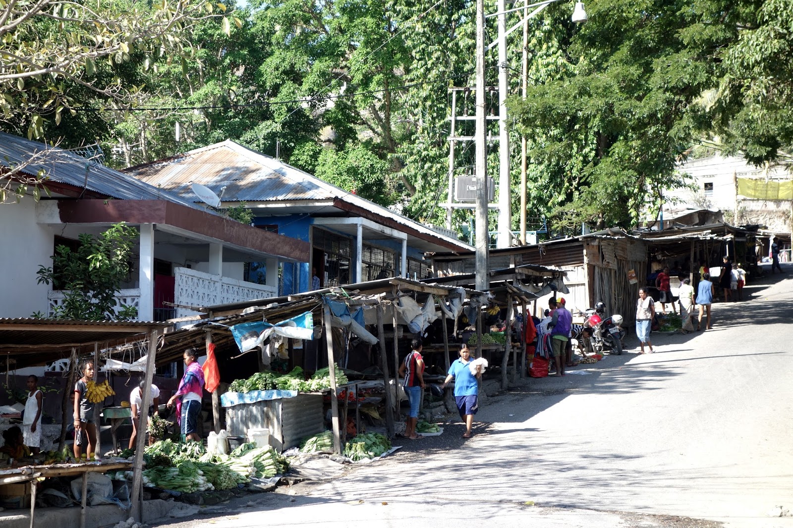 Com ist laut Lonely Planet der einzige Backpacker-Hub, den es bisher in Timor Leste gibt. Wir sind nach den Erfahrungen mit Bacau zwar skeptisch, aber schließlich hat uns der LP schon so lange begleitet, ein Ausrutscher ist ja mal erlaubt. Die 8 Kilometer hoch nach Bacau sammelt uns gott sei dank ein Microlet (so heißen die Minibusse hier) auf, denn es beginnt bereits richtig heiß zu werden. Der Umstieg in den nächsten Minibus klappt reibungslos. Auf der Fahrt halten wir an einem Fischmarkt an und ein älterer Mann kauft fröhlich ein paar Fische, die wohl etwas zu lange in der Sonne gelegen haben. Spitze. Verständigung ist schwierig, Englisch spricht niemand, mein Portugiesisch ist mehr als rudimentär und Indonesisch will ich aus historischen Gründen nicht anwenden. So bleiben wir dabei alle freundlich anzulächeln, was nicht immer erwidert wird. Noch einmal müssen wir den Bus an einer Kreuzung in Lautem (mitten im Nichts) wechseln, diesmal klappt es nicht so reibungslos. Geschlagene drei Stunden stehen wir im Staub. Immerhin können wir uns hier unterhalten, es gibt eine Englisch-Schule in der Nähe. Viele Schüler warten mit uns. Ein junger Mann quittiert das lange Warten mit den treffenden Worten: “This is the condition of our country.” (Das ist der Zustand unseres Landes.) Wir werden erst noch erfahren wie recht er hat. Wir wollten nach Timor Leste. Hier stehen wir nun. Irgendwann kommt ein LKW-Truck, beladen mit Kürbissen, Säcken von irgendetwas, ein paar Ersatzreifen und einer Wagenladung Kinder. Für einen Dollar kommen wir mit dem Truck nach Com. Also nichts wie rauf. Unter ohrenbetäubend lauter 90er Trashmusik fahren wir so die 20 Kilometer nach Com. Dort angekommen suchen wir eine Unterkunft. Wir finden ein komplett ausgestorbenes Dorf vor, ein leeres Hotel reiht sich an das andere, die wenigen Bewohner sind nicht da oder sitzen vor ihren Häusern. Die Zimmer sind extrem überteuert – 50 Dollar die Nacht – verhandeln wollen die Besitzer nicht, trotz des Leerstandes. Wir nehmen die einzige Unterkunft mit Dusche, die nicht völlig überteuert ist. Es gibt hier keine Restaurants, man kann für 8 Dollar pro Person ein Abendessen bestellen, von dem man nicht weiß, was es sein wird. Auch sonst gibt es hier wirklich nichts außer Strand, jeder Menge Kinder und einiger Frauen, die versuchen einem etwas zu verkaufen. Was wir prompt vor lauter Langeweile auch tun. Das Highlight hier sind die unzähligen Schweine und Schweinchen in allen Farben, die am Strand nach Essbarem wühlen.