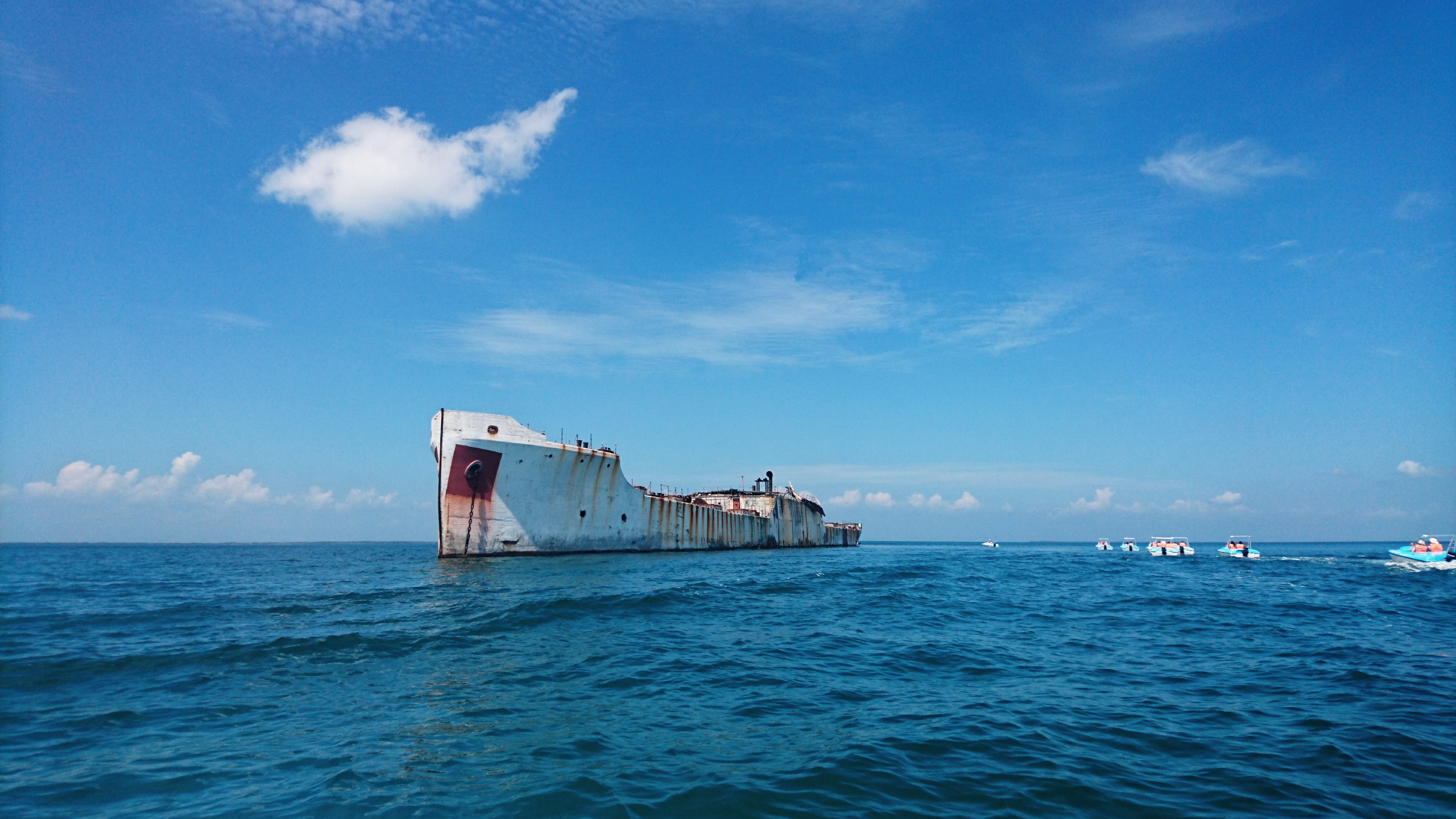 Vor der Küste von Cayo Santa Maria liegt ein Schiffswrack, die „San Pasquale“, die vor achtzig Jahren dort aufgelaufen ist. Das Wrack ragt hoch aus dem Wasser und ich würde es nur zu gern erkunden. An den Schiffswänden und auf Deck haben sich etliche mit ihren Namen verewigt. Octavio gesteht, dass er schon mehrfach auf dem Wrack war, aber wir dürfen nicht rein, es ist zu gefährlich. Am witzigsten ist aber, dass die Luft um das Schiff stark nach Rum duftet, da die San Pasquale damals Melasse geladen hatte, ein Nebenprodukt der Zuckerherstellung, das zur Herstellung von Rum benutzt wird. Ich finde es unfassbar, dass der Geruch seit 80 Jahren anhält. Wie nebenbei stellt Octavio kurz darauf die Frage, die hier jeder kubanische Mann stellt: Ob ich einen Freund habe. Auf die Verneinung schlägt er voller Fassungslosigkeit mit der flachen Hand aufs Boot und schüttelt den Kopf… Und sagt dann, ich könne ja mit zu ihm kommen. Aber er lacht dabei, er hat es nicht ganz ernst gemeint. Er scheint seinen Ehering etwas ernster zu nehmen als viele andere Kubaner, wenn man den Erzählungen glauben darf. Später gehen wir schnorcheln, aber es gibt nicht viele Fische zu sehen, da bin ich von Indonesien auf jeden Fall anderes gewöhnt. Die Korallen sind allerdings sehr schön. Zum Abschied kriegen wir einen Schluck Rum geschenkt und dann muss ich auch schon los, Sophia und unser Convertido mit Carlos warten schon auf uns.