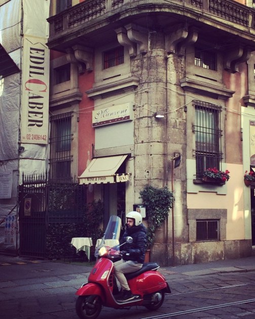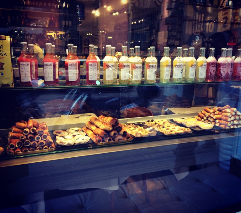 Vor sechs Jahren war ich das letzte Mal in Milano, damals bin ich allerdings nur kurz am Hauptbahnhof umgestiegen. Trotzdem war es der Beginn meiner wundervollen Reise auf der Via Francigena, an die ich mich nun zurückerinnerte (hier nachzulesen). Was ist nicht alles passiert in diesen sechs Jahren! Die Zeit damals auf dem italienischen Camino war so wundervoll, ich habe damals die Italiener, ihr Land und ihre Kultur tief in mein Herz geschlossen. Und so schlenderte ich bestens gelaunt gegen elf Uhr auf der Suche nach einer brioche con chiocolatte (einem italienischen Schokocrossaint) durch die Straßen von Mailand Richtung piazza del duomo. Leider – und das hatte ich schon befürchtet – ist kurz vor Mittag etwas spät für eine Brioche, denn überall waren sie schon ausverkauft. Aber nichts konnte meine Laune trüben und als mein Spazierweg mich auf die Via Allessandro Manzini führte, fand ich dort neben zahlreichen Luxusgeschäften auch eine echte italienische Bar, komplett mit absolut überwältigender Süßkramauslage. Ich nahm Abschied von meinen Neujahrsvorsätze weniger Zucker zu mir zu nehmen und begrüßte zwei Creme- und Schokoladegefüllte Teigröllchen. Man lebt schließlich nur einmal! Und wie soll man da auch widerstehen? Italien ist für Naschkatzen was die Opiumhöhle für Heroinjunkies – nur der richtig gute Stoff in jeder zweiten Fensterauslage. 😉